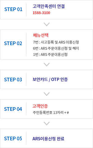 - 메뉴선택 7번:사고등록 및 ARS 이용신청 6번:ARS 주문이용신청 및 해지 1번:ARS 주문이용신청