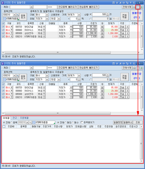 ¹öưÀ» Ŭ¸¯ÇϽðųª, Űº¸µå ´ÜÃàŰ F11À» ´©¸£½Ã¸é, 'ÁÖ½Ä ÀϰýÁÖ¹® È®ÀÎâ' ÀÌ ÆË¾÷ µÇ¸ç, ¼±ÅÃÇÑ Á¾¸ñ¿¡ ´ëÇÑ ÀϰýÁÖ¹®ÀÌ ½ÇÇàµË´Ï´Ù.