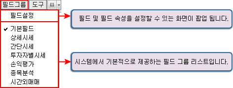 ¹öưÀ» Ŭ¸¯ÇÏ¸é ½Ã½ºÅÛ¿¡¼­ Á¦°øÇÏ´Â Çʵå±×·ì ¸®½ºÆ®¸¦ Á¶È¸ÇÒ ¼ö ÀÖÀ¸¸ç.¡®Çʵ弳Á¤¡¯ À» ¼±ÅÃÇϸé ÇÊµå ¹× ÇÊµå ¼Ó¼ºÀ» ¼³Á¤ÇÒ ¼ö ÀÖ½À´Ï´Ù.