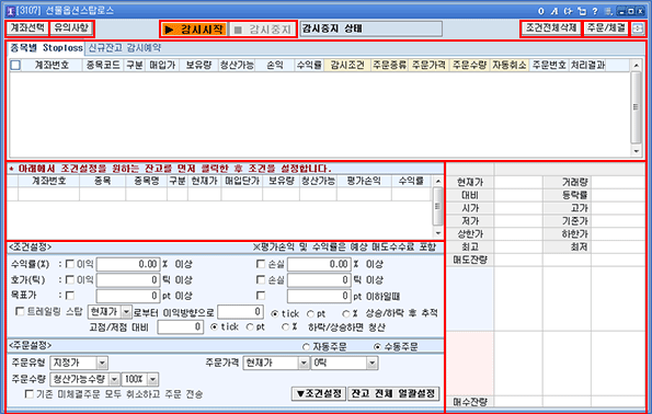 ¼³Á¤ÇÑ °¨½ÃÁ¶°ÇÀº Àû¿ë Á¾¸ñÀÇ °¨½Ã¿¡ Àû¿ëµÇ´Â Á¶°ÇÀ» ¼³Á¤ÇÏ´Â °ÍÀ¸·Î, ÇØ´ç Á¾¸ñÀÇ ½Ã¼¼¸¦ °¨½ÃÇÏ¿© ½ºÅ¾·Î½ºÁÖ¹®ÀÇ ½ÇÇà Á¶°ÇÀ» ã¾Æ³»´Â ¿ªÇÒÀ» ÇÕ´Ï´Ù.