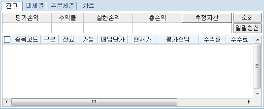 잔고: 장 중 실행한 주문의 체결에 의하여 보유하게 된 계좌잔고를 실시간으로 조회할 수 있는 화면입니다.