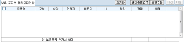 탐색보유 포지션의 델타값을 가감하여 중립상태를 유지할 수 있도록 종목과 수량을 계산합니다. 델타중립 결과가 도출되면 델타의 합계부분이 0에 근접하게 형성됩니다.