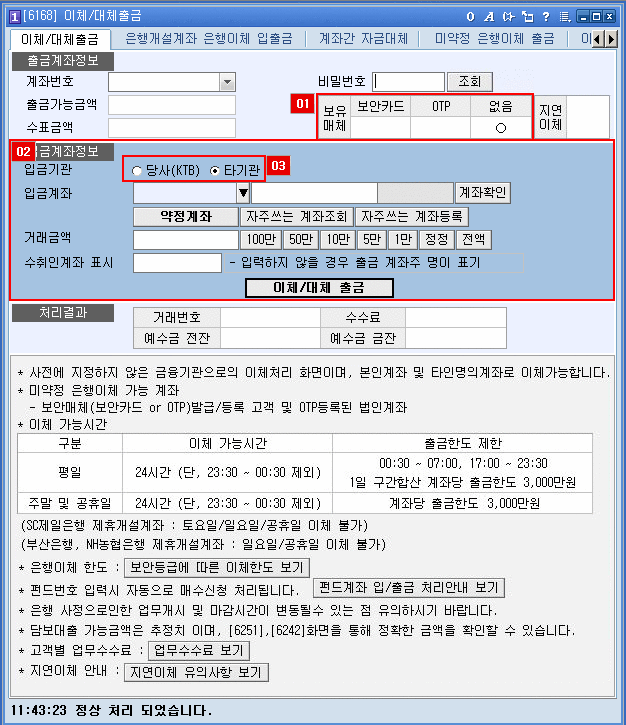 당사(KTB)를 선택 시 당사(KTB)개설계좌 내에서 본인명의/타인명의 계좌로 대체 가능하고, 타기관을 선택 시 타기관의 약정계좌/미약정계좌로 출금 가능합니다.
