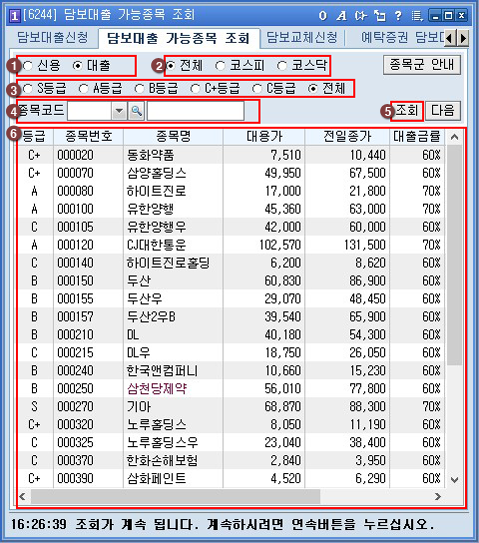 Á¶È¸Á¶°Ç¿¡ ¸Â´Â ´ãº¸´ëÃâ °Å·¡°¡´É Á¾¸ñ ¸®½ºÆ®¿Í '´ë¿ë°¡°¡, ÀüÀÏÁ¾°¡,º¸Áõ±Ý·ü' µîÀ» Á¶È¸ÇÒ ¼ö ÀÖ½À´Ï´Ù.